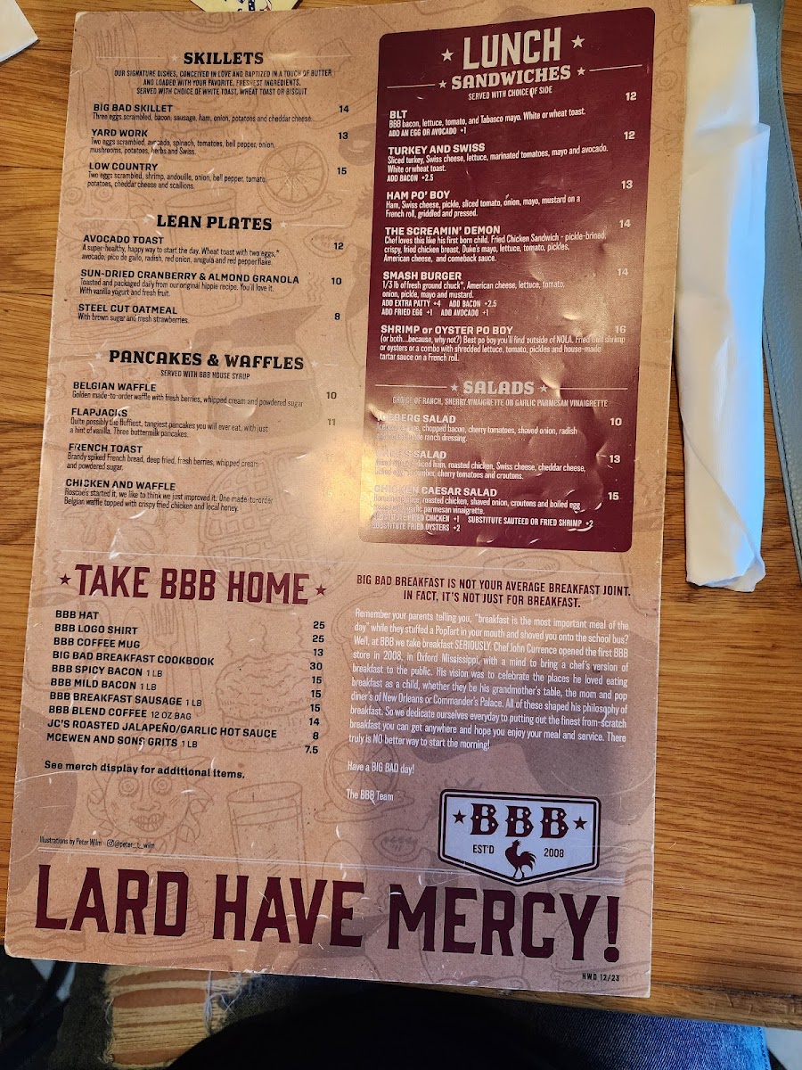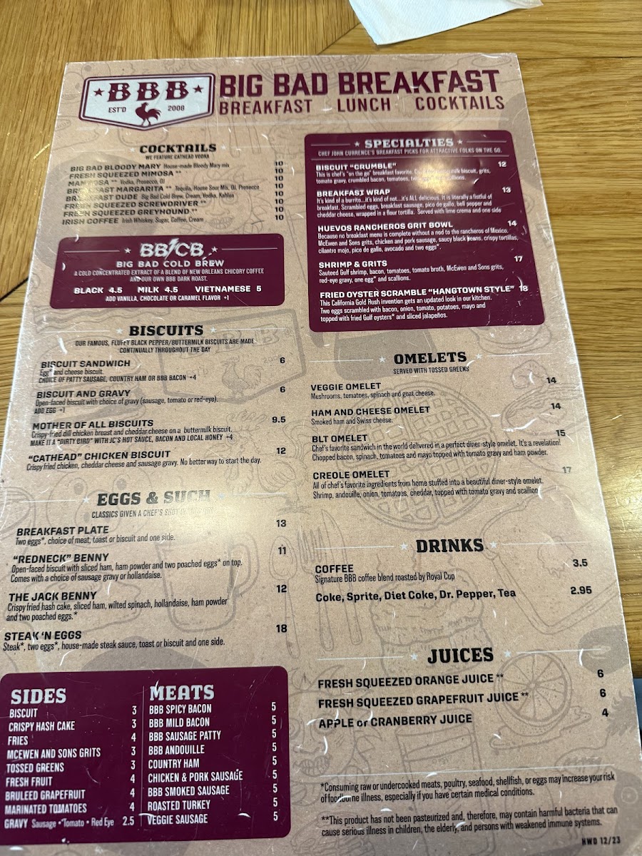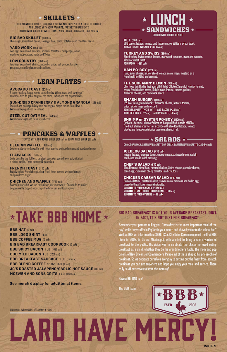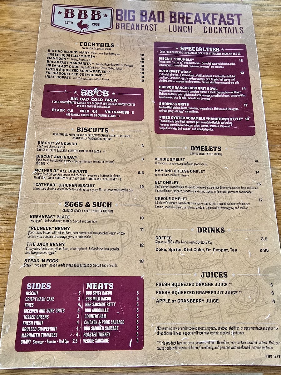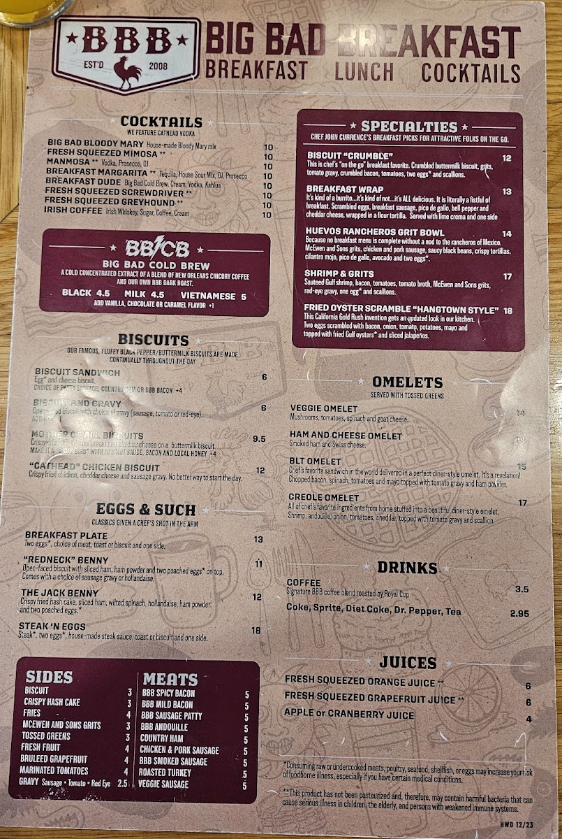 The menu at Big Bad Breakfast offers a warm, approachable selection focused on hearty breakfast and brunch favorites served throughout the day. It strikes a balance between classic Southern comfort and creative twists, perfect for those seeking casual bites in a relaxed café setting.